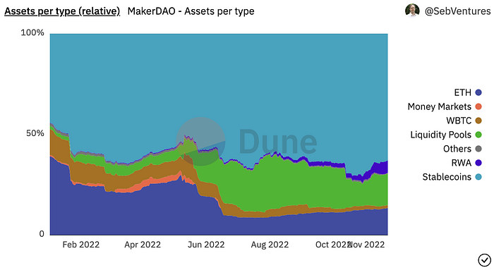 This includes centralized stablecoins and short-term government bonds. To maximize the usefulness of DAI as a currency compared to smaller stablecoins such as USDC, it is necessary to secure assets that are stable and liquid. Therefore, DAI accepts stablecoins and low-risk short-term government bonds as collateral to fill in the liquidity and stability currently lacking in DAI. One of the main drawbacks of Cashlike RWA is that centralized assets are easily exposed to government seizure risks. Therefore, in the long term, it is necessary to reduce the proportion of DAI’s collateral composition.
