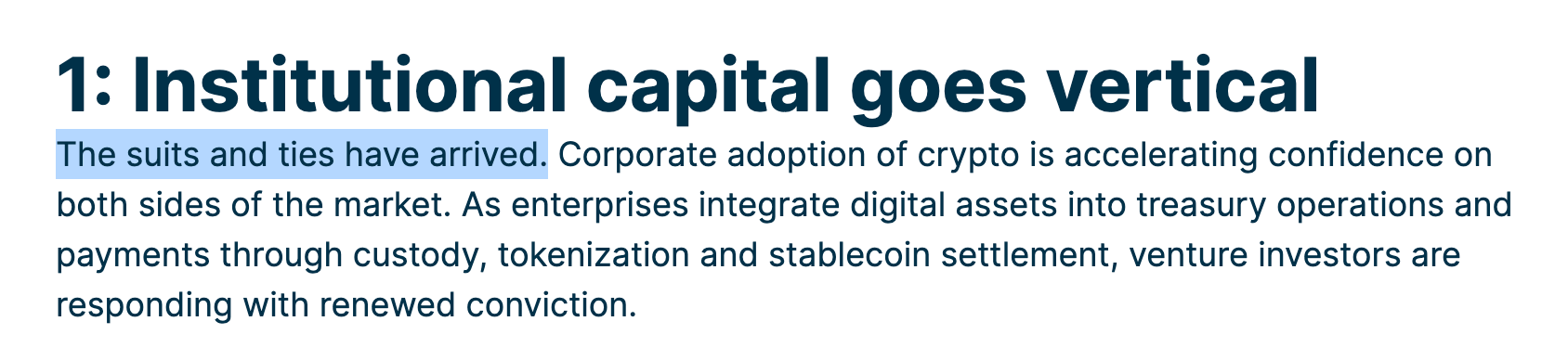 중요한 것은 크립토 네이티브 기업이 인력을 축소하는 동시에 월스트리트의 주요 금융기관은 크립토 인력을 확대하고 있다는 점이다. 이는 단순한 아이러니가 아니라 산업의 무게중심이 이동하고 있음을 의미한다.