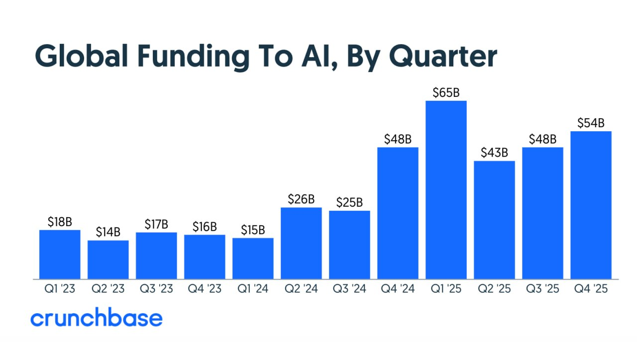 크립토 기업의 AI 피봇을 이해하려면 먼저 AI 시장과 크립토 시장의 투자 현황을 살펴봐야 한다. 2025년 한 해 동안 전체 벤처 투자금 4,250억 달러 중 AI 분야에만 2,110억 달러가 투자되었다. (약 51%) 같은 기간 크립토 VC 딜 수는 1,050건에서 830건으로 21% 감소했다.
