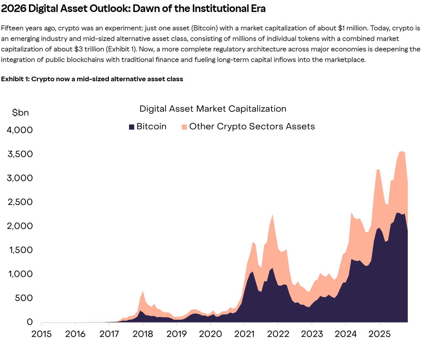 크립토 업계의 구조적 재편은 AI 피봇보다 더 근본적인 동력에 의해 주도되고 있다. Grayscale은 2026년을 "기관 시대의 도래(Dawn of the Institutional Era)"으로 명명하며, 매크로 수준의 대체 가치 저장 수요와 규제 명확성의 개선이 새로운 자본 유입과 채택 확대를 가속화할 것으로 전망했다.