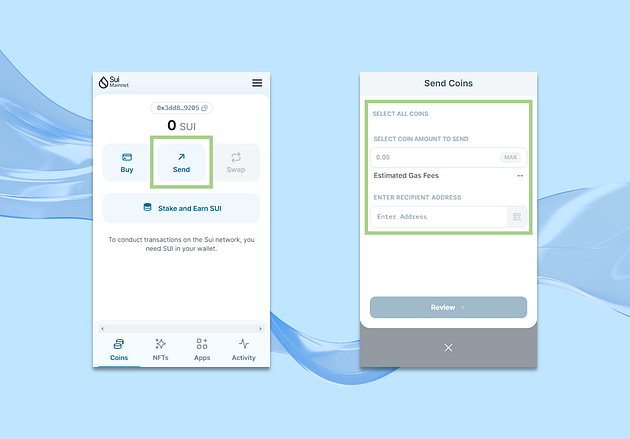 수이 월렛 첫 화면에서 Send 버튼을 누르시면 수이 월렛에 보유하고 있는 토큰, 자산 등을 다른 사용자에게 전송할 수 있습니다.
