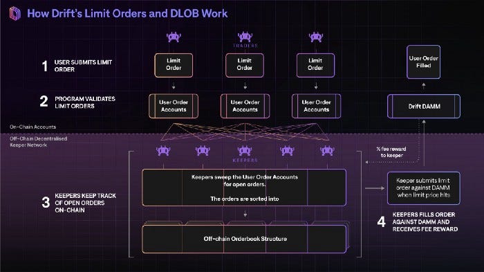 지정가 주문이 실시간으로 나열 (높은 계산 능력 필요) 되며 트레이더 간에 매칭이 이루어지는 전통적 오더북을 구현한 것은 아닙니다. 드리프트가 구현한 탈중앙화 오더북은 AAVE와 같은 렌딩 프로토콜에서 Liquidator로서 참가한 네트워크 참여자가 조건에 합당한 담보 자산의 청산을 실행하는 방식과 유사합니다.
