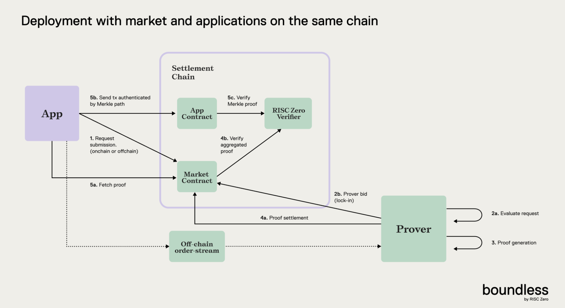 바운드리스의 베리파이어 컨트랙트와 마켓 컨트랙트는 이더리움(Ethereum), 베이스(Base) 등의 세틀먼트 전용 네트워크(Settlement Chain)에 배포되어 운영됩니다. 또한 애플리케이션 개발자가 배포하는 앱 컨트랙트 역시 상기한 세틀먼트 전용 네트워크를 기반으로 구동하며 검증된 증명을 받아 비즈니스 로직을 실행하는 구조를 가지고 있습니다.