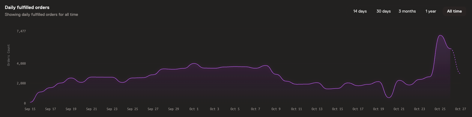 출시 이후 작성일인 10월 27일까지 바운드리스를 통해 실행된 누적 증명 요청은 총 1.4M 개로, 바운드리스보다 먼저 출시된 경쟁 프로토콜인 서신트 대비 약 2배 높은 성과를 보이고 있습니다.