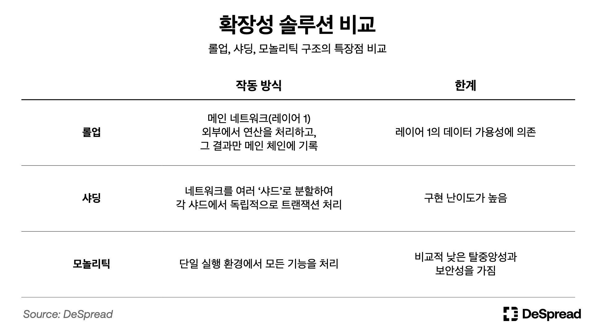 한편, 모든 프로젝트가 동일한 방식을 추구한 것은 아니었습니다. 솔라나(Solana)와 수이(Sui)로 대표되는 일부 블록체인들은 보안성과 탈중앙성의 일정 부분을 포기하더라도 높은 확장성을 우선시하는 모놀리틱 구조를 채택하였으며, 빠른 거래 처리와 개선된 유저 경험을 내세우며 산업 내 입지를 확보하였습니다.