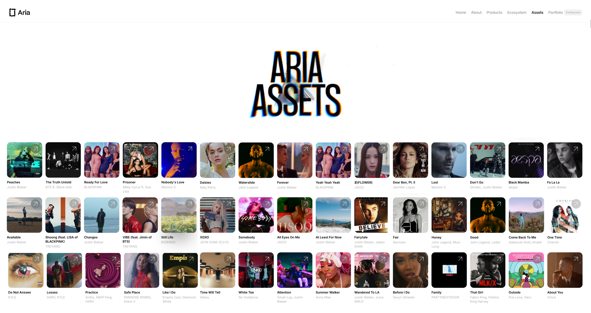 Aria의 첫 번째 IP 자산인 APL은 2025년 2월에 출시되었다. 이는 Justin Bieber, Miley Cyrus, BLACKPINK, BTS, Selena Gomez가 공연한 48곡의 부분 저작권으로 구성되었으며, 참여자들은 스트리밍, 동기화, 공연 로열티에서 발생하는 수익에 접근할 수 있다. StakeStone의 LiquidityPad를 통해 1,095만 달러가 조달되었으며, 이는 음악 IP 토큰화 사례 중 가장 큰 규모였다.